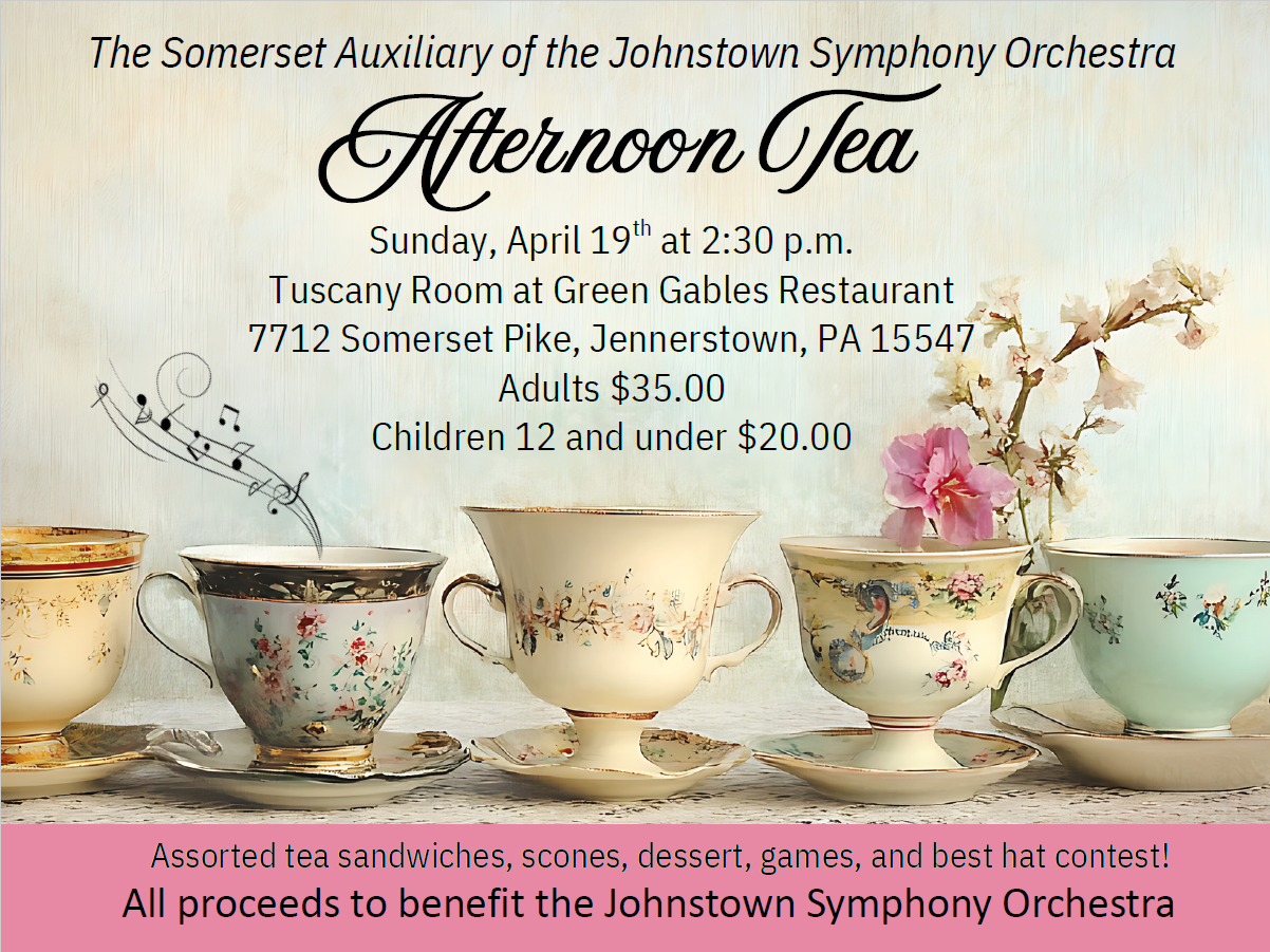 Join us on Saturday, April 19 for the Johnstown Symphony Orchestra’s annual Symphony Tea, a beloved spring tradition hosted by our Somerset Auxiliary. This elegant afternoon brings friends of the Symphony together to enjoy good company, delicious refreshments, and a shared love of music and community.