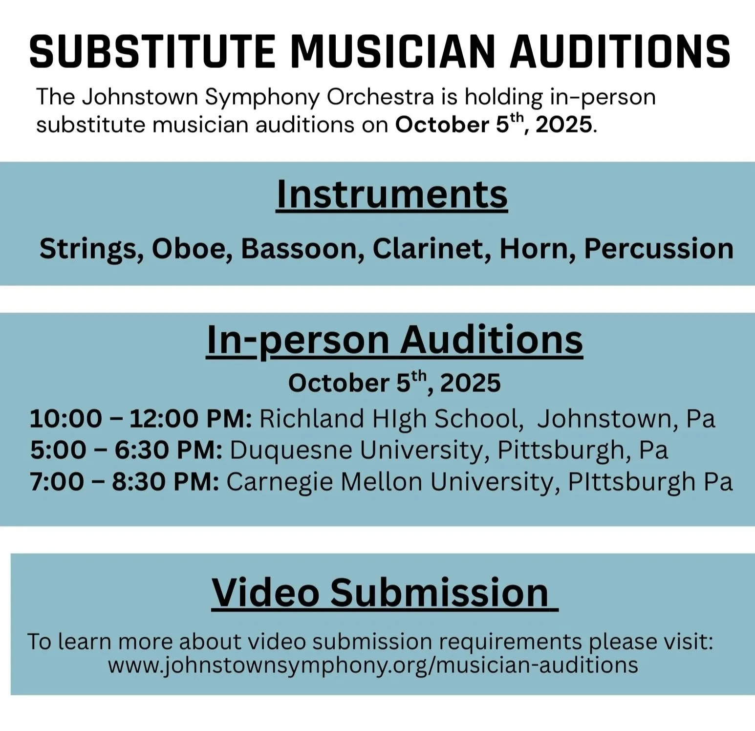 The Johnstown Symphony Orchestra welcomes talented professional musicians who are passionate about performance and committed to artistic excellence. As a member of the JSO, you'll have the opportunity to perform dynamic repertoire alongside exceptional colleagues and contribute to one of the region’s most vibrant cultural institutions.